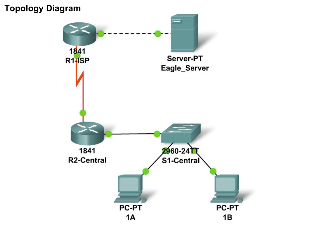 R2-Central(config)# interface serial 0/0/0 R2-Central(config-if)# ip address 192.168.3.97 255.255.255.252 R2-Central(config-if)# no shutdown R2-Central(config-if)# exit