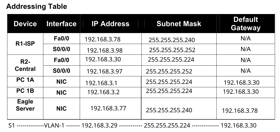 - PC 1A (Fa0/1 on S1-Central): 192.168.3.1 mask 255.255.255.224